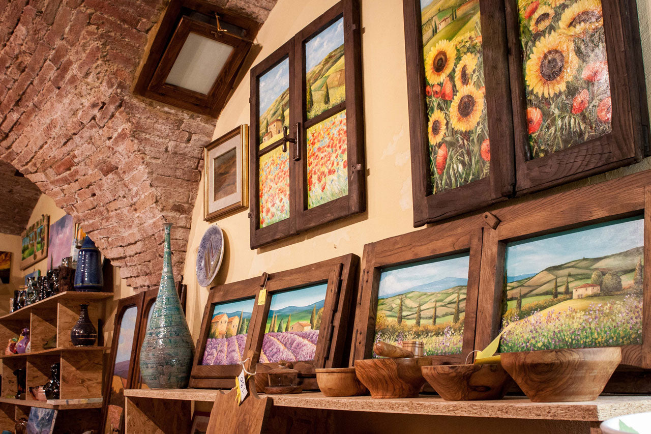 A wide choice of paintings and unique pieces. Tuscan landscapes are reproduced on various surfaces such as shutters and windows, which have the singularity of being original pieces, belonging in the past to old country cottages, renovated and repaired, thus lending themselves to receiving the artist's brushstrokes, but there are also canvases, barrel staves and then we could not miss the ceramics in all their forms, from gifts to souvenirs... The techniques used vary from acrylic to spatula oil. All our works are unique objects signed by various authors and provided with their certificate of guarantee.